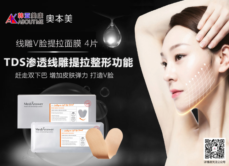 韩国ABOUT ME奥本美线雕V脸提拉面膜融入三养生命科学、生物核心生物技术,医用PGLA成分助力肌肤紧致提拉,V脸见效快,持久不反弹。PNK皮肤临床研究中心推荐,ABOUT ME奥本美线雕V脸提拉面膜胶原蛋白肽经皮传递直达,填充肌肤底层,改善肌肤底层弹性; PGLA,溶解手术线的主原料,体内分解速度快副作用小,安全可靠有助肌肤紧致弹力和提拉;胶原蛋白多重肌能够合并-排列-紧致-固定形成紧密弹性网,让肌肤紧致有弹性,脸部逐渐缩小,固定V字脸。线雕V提拉面膜2018-2019年销售突破1200万片爆款!