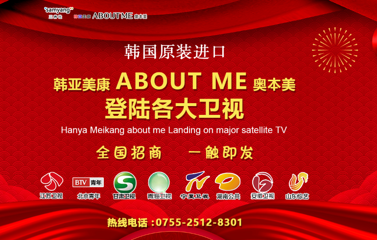 韩国原装进口品牌韩亚美康ABOUT ME奥本美全国招商即将登陆八大卫视:江苏卫视、北京青年、甘肃卫视、青海卫视、宁夏卫视、湖南公共、安徽卫视、山东综艺。韩亚美康ABOUT ME奥本美全国招市代理!前20名代理邀请到韩国总部参观学习、旅游!韩国原装进口产品!百年企业医美级专利技术优势!隆重祝贺八大电视台联名推荐之甘肃卫视首播!咨询热线0755-2512-8301