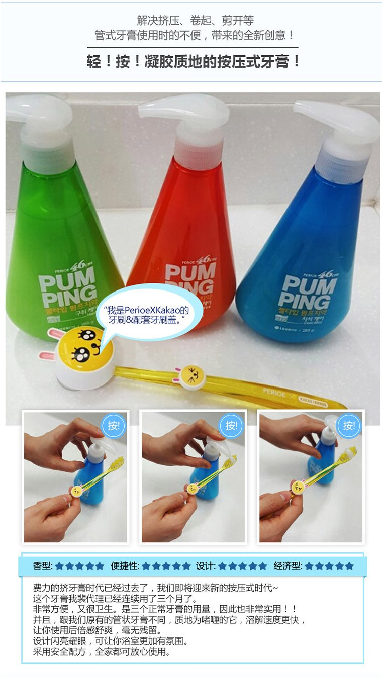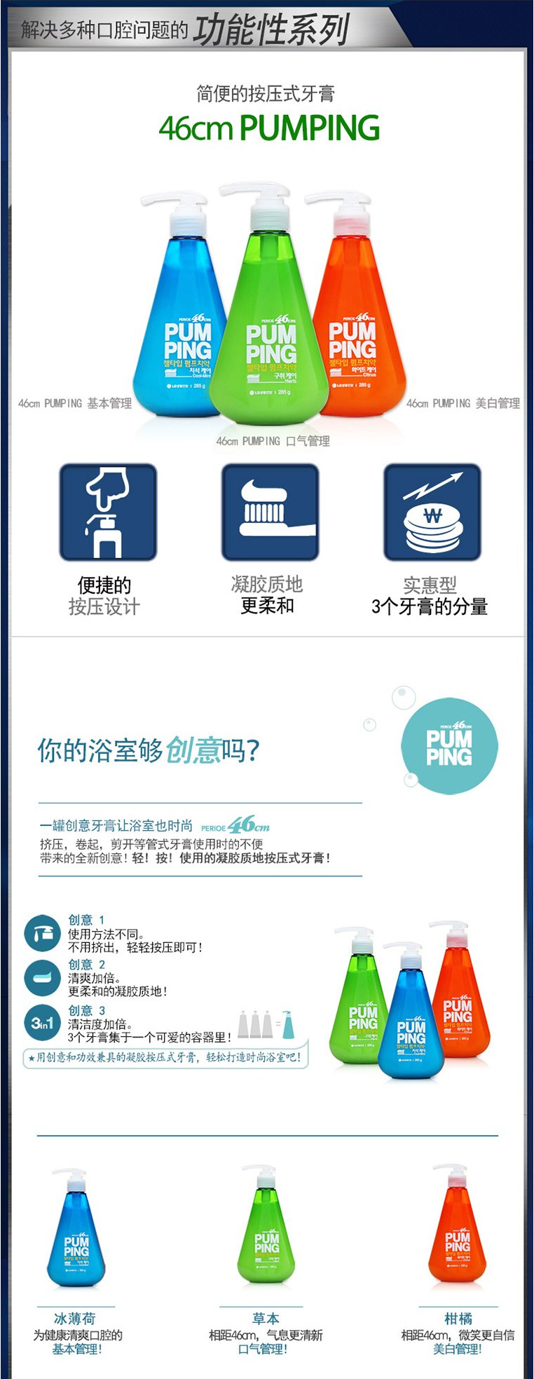 轻松按压使用的去齿垢护理,按压式凝胶牙膏具有丰富的薄荷香,相当于3支牙膏的容量, 非常划算