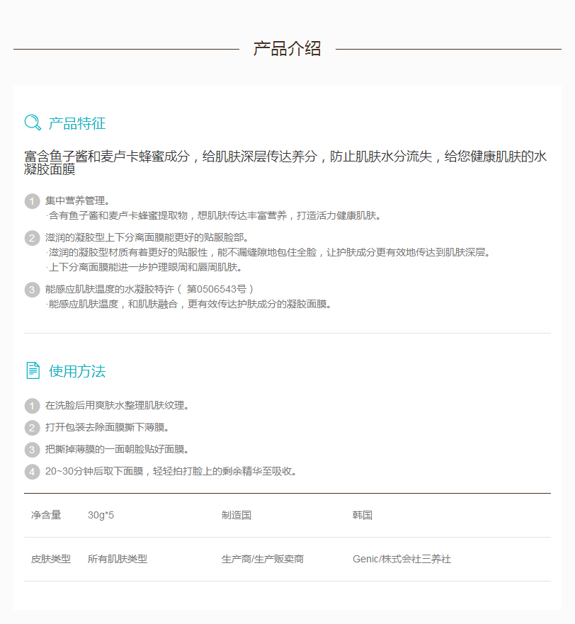 富含鱼子酱和麦卢卡蜂蜜成分,给肌肤深层传达养分,防止肌肤水分流失,给您健康肌肤的水凝胶面膜