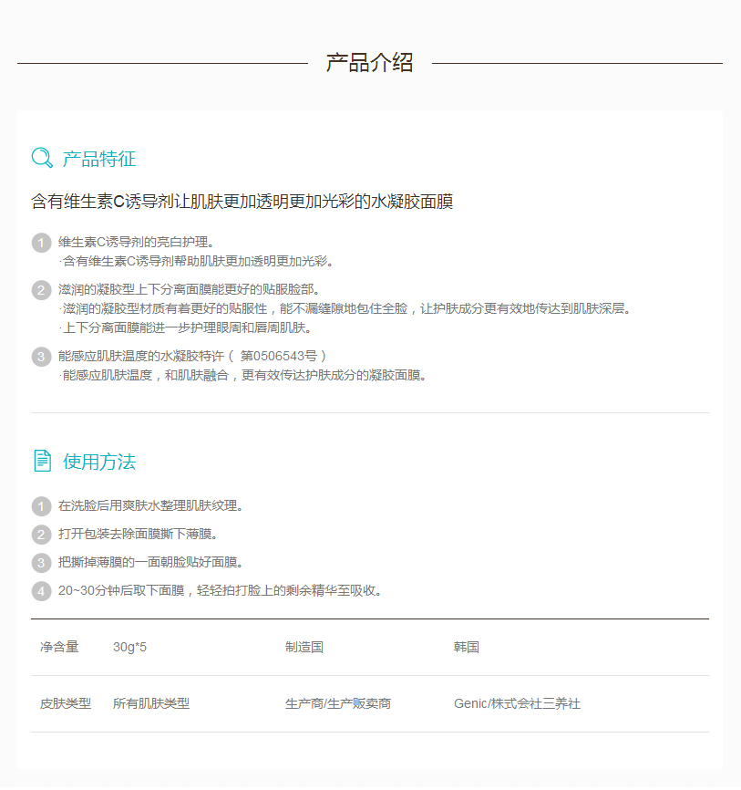 含有维生素C诱导剂让肌肤更加透明更加光彩的水凝胶面膜