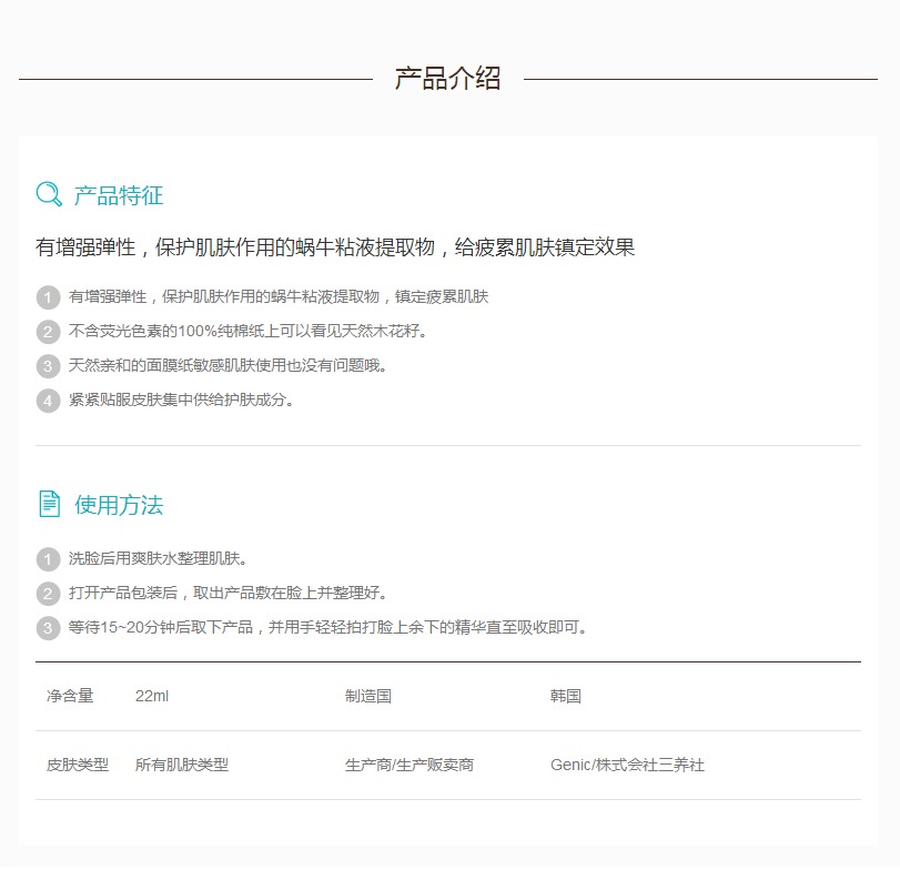 有增强弹性,保护肌肤作用的蜗牛粘液提取物,给疲累肌肤镇定效果