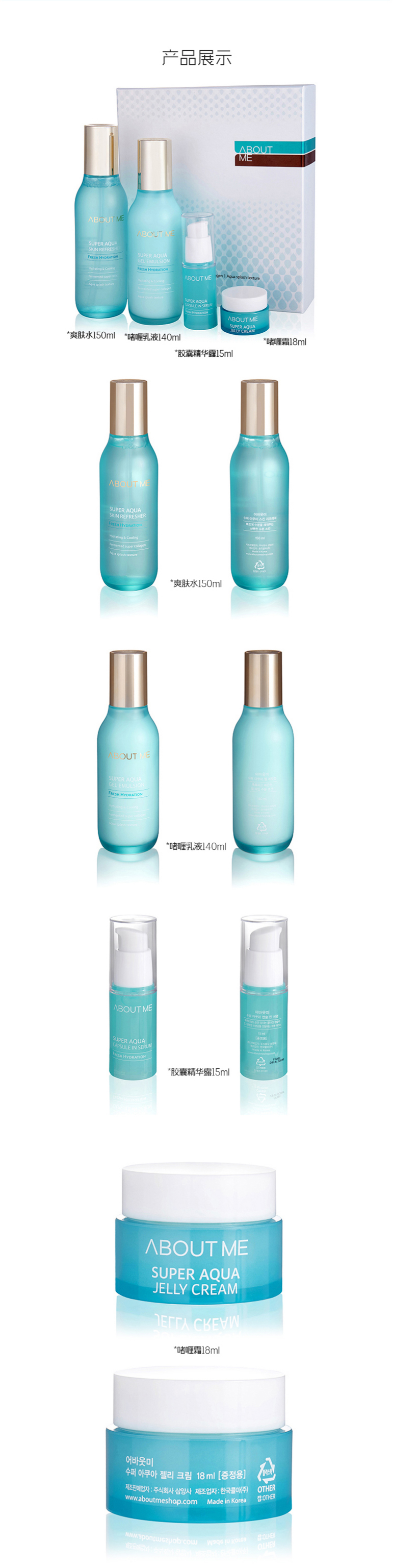 规??格:水 150ml / 乳 140ml / 胶囊精华露 15ml / 啫喱霜 18ml