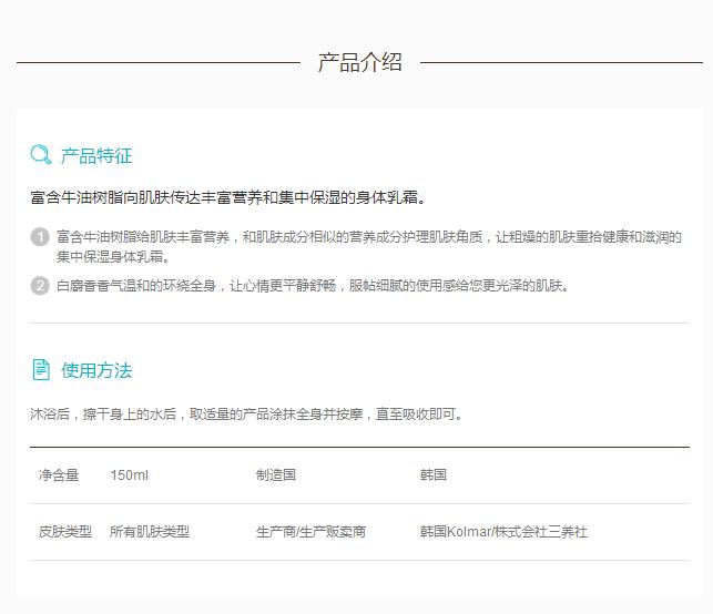 富含牛油树脂向肌肤传达丰富营养和集中保湿的身体乳霜